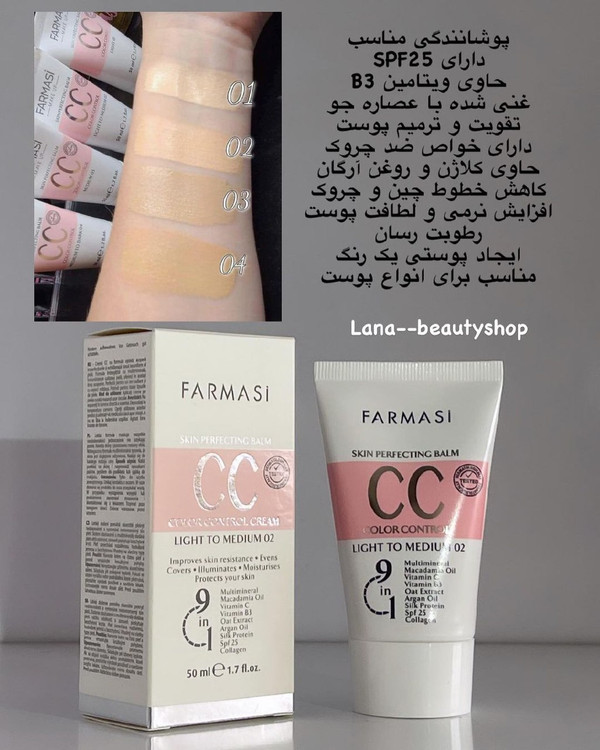 سی سی کرم انواع پوست 9 در 1 فارماسی پوشش بسیار خوبی بر روی پوست داشته و عیوب پوست را کاملاً می پوشاند. روغن ماکادامیای موجود در این کرم پوست را در تمام روز مرطوب نگاه می دارد و ویتامین B3 به پوست ظاهری درخشنده می دهد و عصاره جو، پوست را تقویت و ترمیم می کند. به علاوه پروتئین ابریشم موجود در این کرم، موجب افزایش نرمی و لطافت پوست می گردد و کلاژن و روغن آرگان نیز خطوط نازک و چین و چروک موجود در سطح پوست را کاهش می دهند. فرمولاسیون سی سی کرم فارماسی دارای spf25 می باشد که پوست را در مقابل تاثیرات مخرب اشعه خورشید محافظت می کند.
